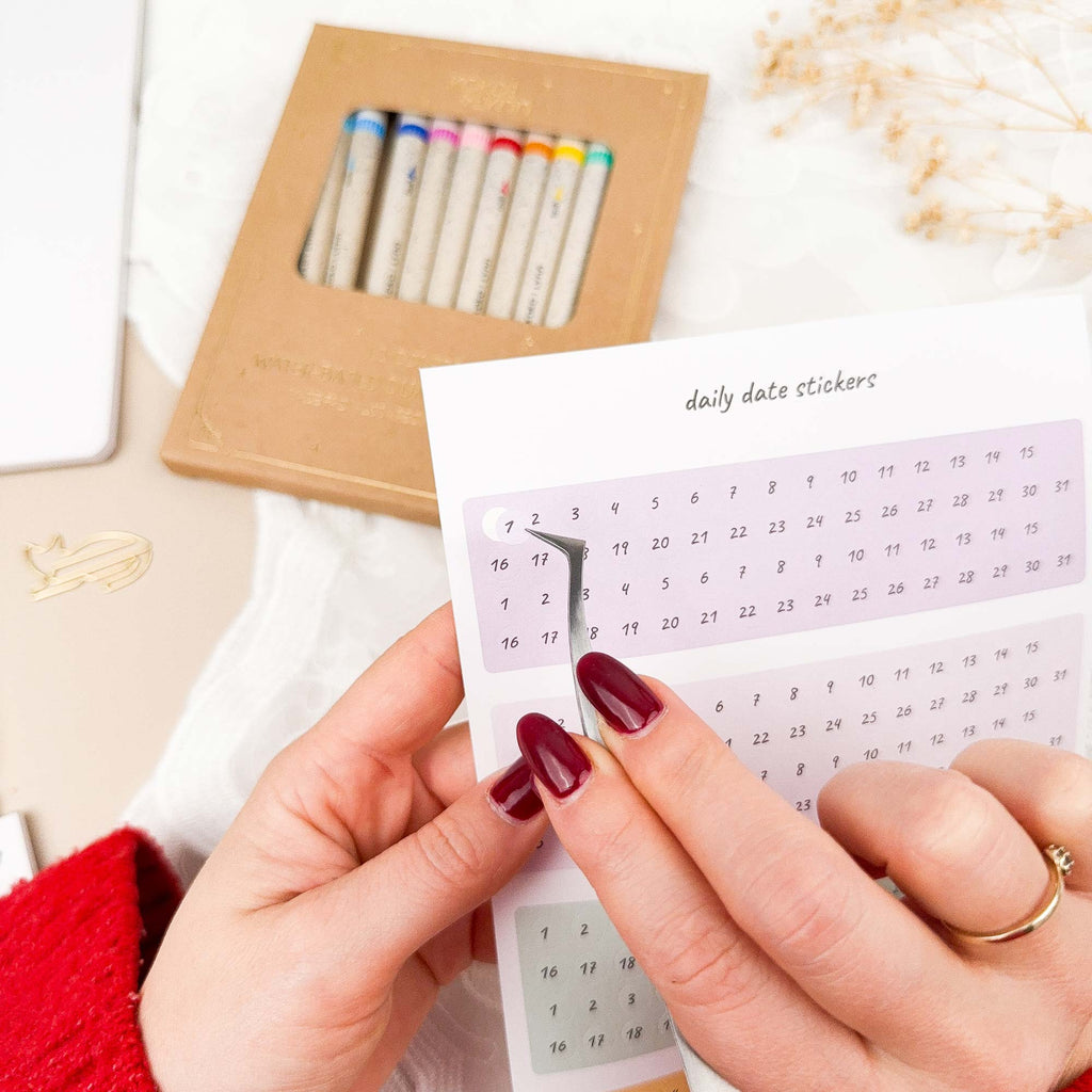 - Daily date stickers for 24 months in colors that coordinate with our monthly theme